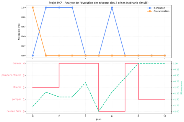 Les résultats montrent que l’agent IA réagit de manière cohérente dans un environnement soumis à deux aléas : des épisodes de pluie (avec une probabilité de survenue modérée) et des pics de contamination (avec une probabilité élevée). Malgré ce risque important de dégradation de la qualité de l’eau, aucun épisode majeur de contamination n’apparaît dans la simulation, suggérant que les mesures préventives apprises permettent de maintenir ce volet sous contrôle. À l’inverse, les inondations constituent la principale source d’instabilité. L’agent augmente alors l’intensité de ses actions lors des pics de crise, puis les réduit lorsque la situation se stabilise, adoptant ainsi une gestion proportionnée et économiquement rationnelle. L’évolution de la « récompense » confirme que les performances du système s’améliorent lorsque les interventions sont alignées sur le niveau réel de risque.